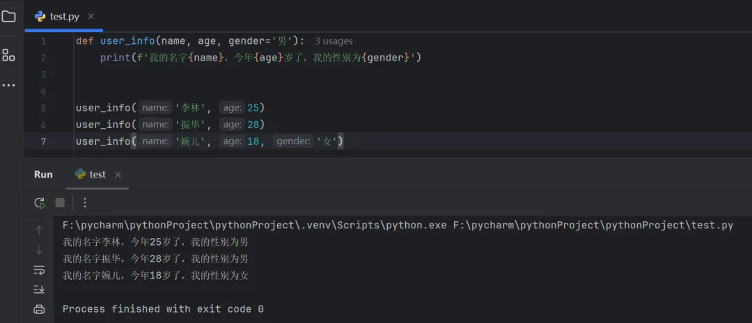 def user_info(name, age, gender='男'): print(f'我的名字{name},今年{age}岁了,我的性别为{gender}')user_info('李林', 25)user_info('振华', 28)user_info('婉儿', 18, '女')