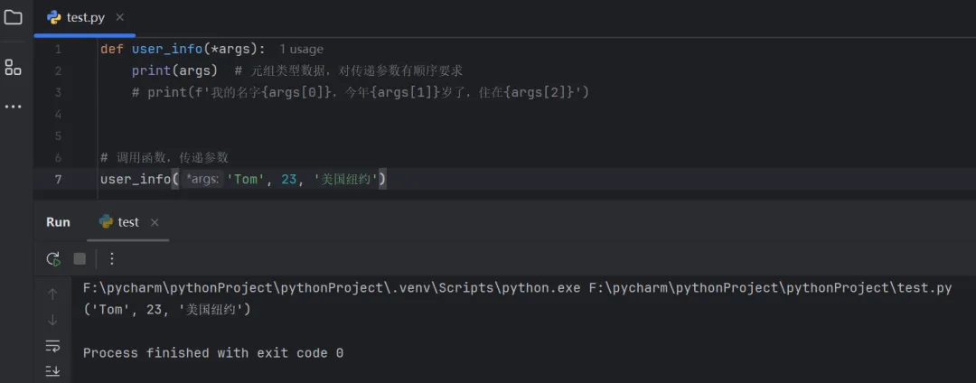 def user_info(*args): print(args) # 元组类型数据,对传递参数有顺序要求 # print(f'我的名字{args[0]},今年{args[1]}岁了,住在{args[2]}')# 调用函数,传递参数user_info('Tom', 23, '美国纽约')