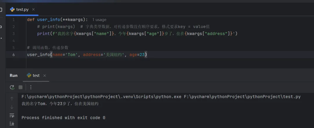 def user_info(**kwargs): # print(kwargs) # 字典类型数据,对传递参数没有顺序要求,格式要求key = value值 print(f'我的名字{kwargs["name"]},今年{kwargs["age"]}岁了,住在{kwargs["address"]}')# 调用函数,传递参数user_info(name='Tom', address='美国纽约', age=23)
