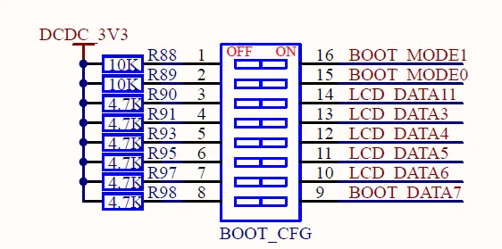 但我的板子引出boot相关引脚如下,拨码开关除了BOOT_MODE0\1外,仅有LCD_DATA几个引脚。