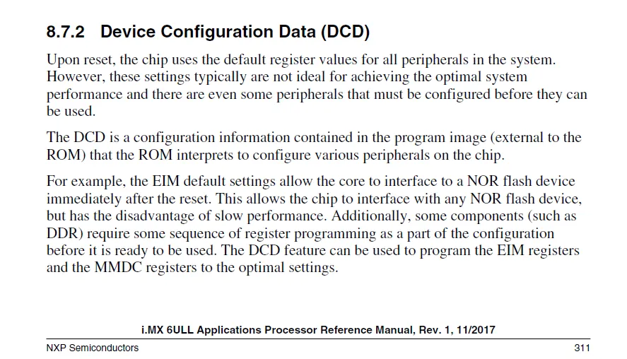 芯片复位后,寄存器值变为默认值,默认值并不是理想情况下能发挥最大性能的值。这个时候就需要通过DCD这块区域来配置一些参数来初始化。说白了,DCD就是一系列寄存器的地址和配置的值。