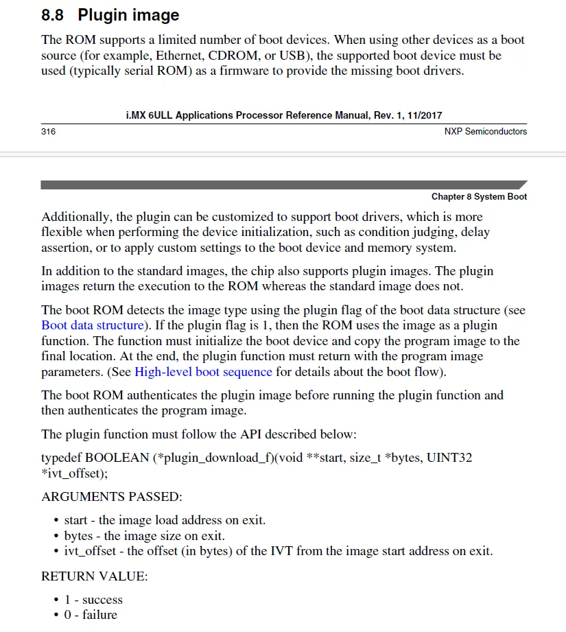 对于不支持的boot引导设备如以太网,Boot ROM 自身并不知道如何读取这些设备上的数据。这时候就需要一个“插件”——即 Plugin Image 来实现。