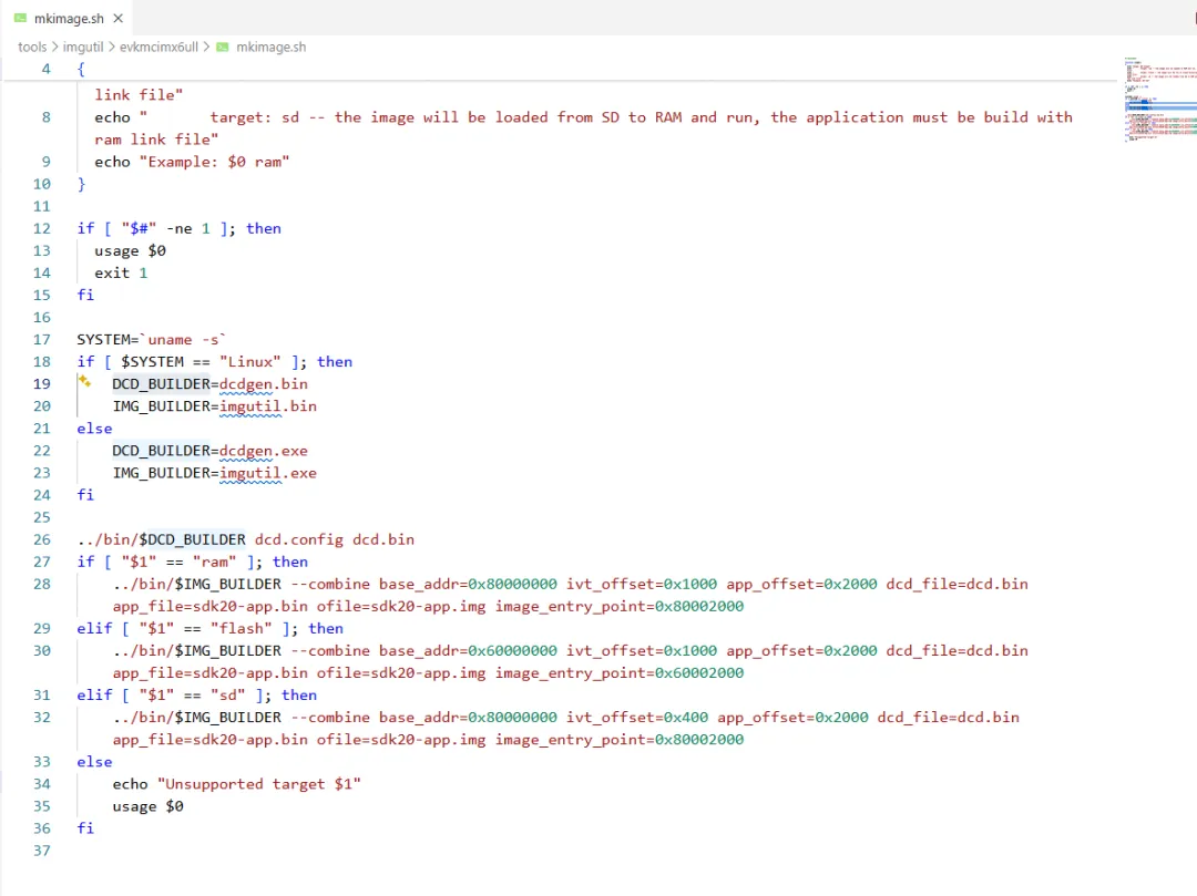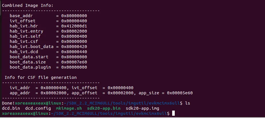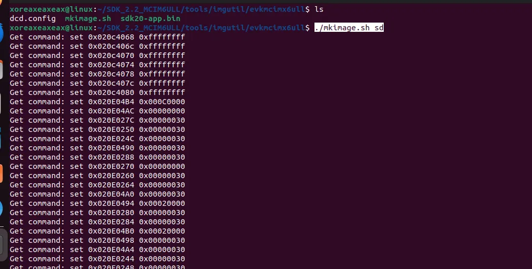 当mkimage脚本执行时,会通过dcdgen提取dcd.config文件来生成对应dcd配置信息,然后按照手册描述规则,把IVT+BootData+DCD一起并添加到程序头部,形成镜像文件。