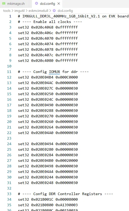 还记得dcd.config吗?内容如上图所示,描述了外设时钟、DDR IO口、DDR、MMC相关配置寄存器的配置信息。