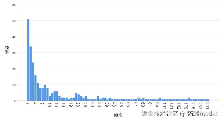 中药频次分布如下图所示,呈现明显的长尾分布特征,少数中药在临床中广泛应用,多数中药针对性使用。