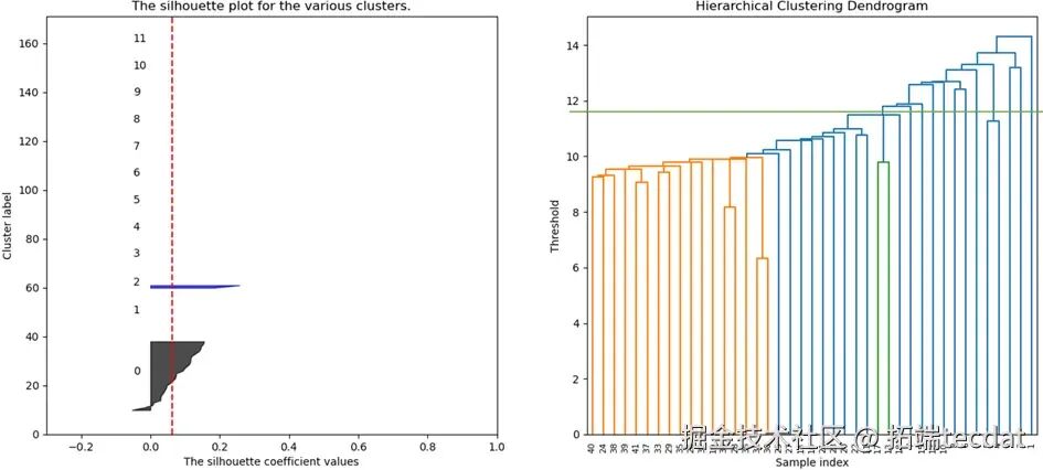 import numpy as npimport matplotlib.pyplot as pltfrom sklearn.cluster import AgglomerativeClusteringfrom scipy.cluster.hierarchy import dendrogram, linkagefrom sklearn.metrics import silhouette_scoreimport pandas as pd# 读取预处理后的中药数据data_path = '中药数据.xlsx'df = pd.read_excel(data_path, usecols="A:RJ", nrows=41)labels = df.iloc[:, 0].values # 提取样本标签(中药名称)data = df.iloc[:, 1:].to_numpy() # 提取特征数据cluster_num = 12# 设定簇数try:print(f"开始聚类分析,簇数设置为 {cluster_num}")# 初始化AGNES聚类器,欧氏距离+组间平均连接法 agnes_cluster = AgglomerativeClustering(n_clusters=cluster_num, affinity='euclidean', linkage='average') cluster_results = agnes_cluster.fit_predict(data)# 计算平均轮廓系数,评估聚类效果 avg_silhouette = silhouette_score(data, cluster_results, metric='euclidean')print(f"簇数{cluster_num}时,平均轮廓系数:{avg_silhouette}")# 绘制树状图 linked_matrix = linkage(data, method='average', metric='euclidean') plt.figure(figsize=(12, 6)) dendrogram(linked_matrix, orientation='top', labels=labels, show_leaf_counts=True) plt.title('层次聚类树状图') plt.xlabel('样本标签') plt.ylabel('距离阈值') plt.show() ... # 省略轮廓系数分布图绘制与结果保存代码except Exception as e:print(f"聚类分析过程中出现异常:{e}")
