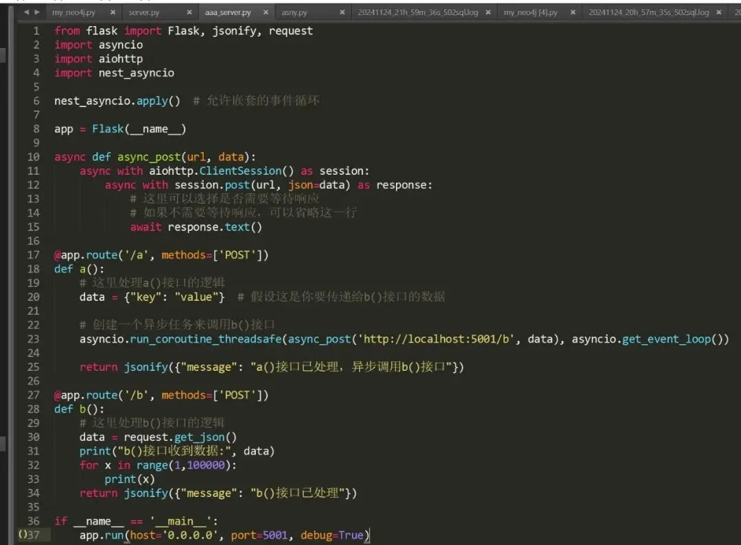 描述:python中,flask框架下,在postman中运行a()接口,想在a()接口中调用b()接口进行异步post传参请求,并且不等待b()接口的返回结果,继续执行a()接口。