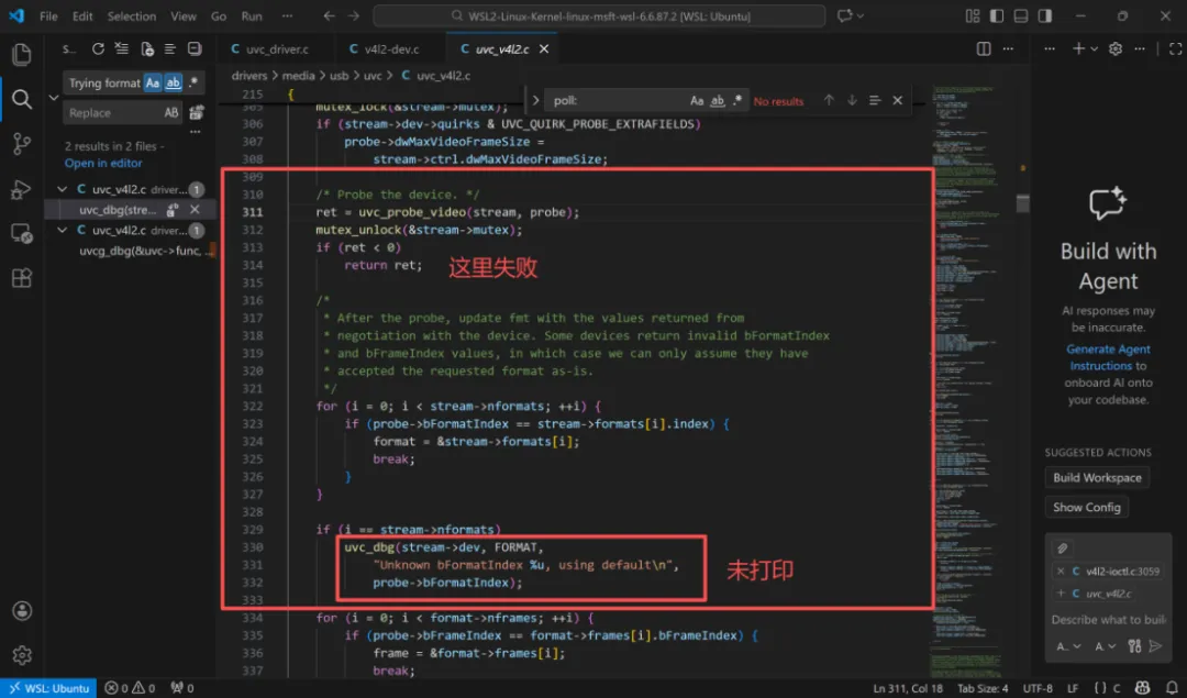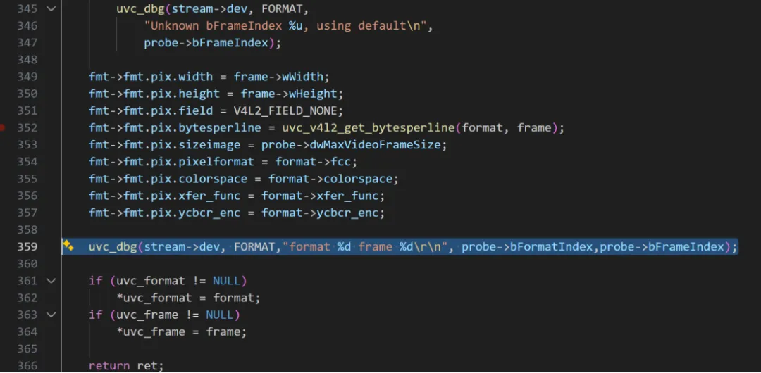 但是如下位置后面没有打印,所以猜测是不是ret = uvc_probe_video(stream, probe);