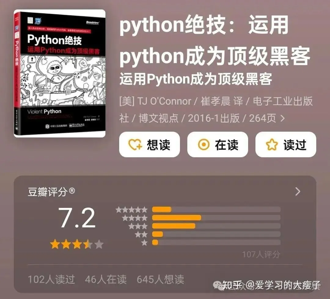 《Python 绝技:运用 Python 成为顶级黑客》豆瓣评分 7.2 分