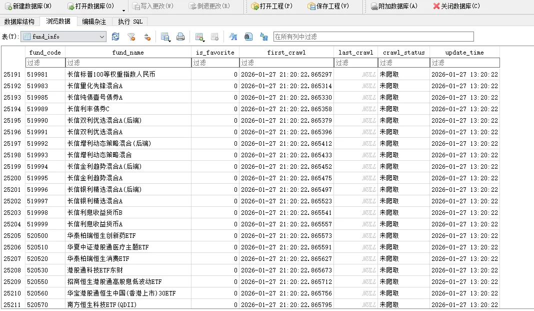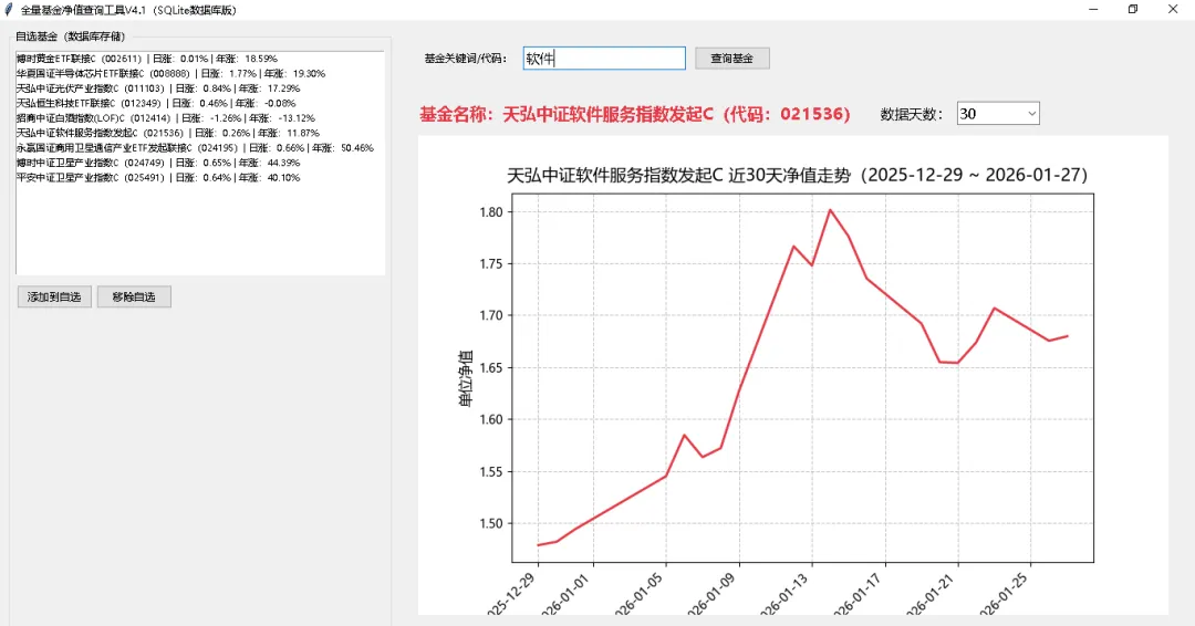 # ========== 核心:数据库初始化(创建fund_info + fund_nav表) ==========def init_database(self):"""初始化数据库,创建2张核心表+全文索引"""conn = sqlite3.connect(DB_FILE)cursor = conn.cursor()# 表1:fund_info(基金基础信息+自选标记)#关注公众号"python万事屋"获取更多源码cursor.execute('''CREATE TABLE IF NOT EXISTS fund_info (fund_code TEXT PRIMARY KEY, -- 基金代码唯一主键fund_name TEXT NOT NULL, -- 基金全称is_favorite INTEGER DEFAULT 0, -- 是否自选:0=否,1=是first_crawl DATETIME, -- 首次爬取时间last_crawl DATETIME, -- 最后爬取时间crawl_status TEXT DEFAULT '未爬取', -- 爬取状态:未爬取/已完成/中断update_time DATETIME DEFAULT CURRENT_TIMESTAMP -- 记录更新时间)''')# 表2:fund_nav(所有基金净值数据)cursor.execute('''CREATE TABLE IF NOT EXISTS fund_nav (fund_code TEXT,nav_date DATE,unit_nav REAL, -- 单位净值update_time DATETIME DEFAULT CURRENT_TIMESTAMP,PRIMARY KEY (fund_code, nav_date), -- 复合主键:避免重复FOREIGN KEY (fund_code) REFERENCES fund_info(fund_code))''')# 索引优化(核心提速点)cursor.execute('CREATE INDEX IF NOT EXISTS idx_fund_code ON fund_nav(fund_code)')cursor.execute('CREATE INDEX IF NOT EXISTS idx_nav_date ON fund_nav(nav_date)')cursor.execute('CREATE INDEX IF NOT EXISTS idx_fund_name ON fund_info(fund_name)') # 新增名称索引conn.commit()conn.close()print("✅ 数据库初始化成功!已创建fund_info + fund_nav表 + 索引")# ========== 核心:从数据库读取基金净值数据 ==========def get_fund_data_from_db(self, fund_code):"""从fund_nav表读取基金净值,返回DataFrame"""sql = '''SELECT nav_date, unit_navFROM fund_navWHERE fund_code=?ORDER BY nav_date ASC'''result = self.db_query(sql, (fund_code,))if not result:return pd.DataFrame()# 转成DataFrame(适配原有计算/绘图逻辑)data = [(row['nav_date'], row['unit_nav']) for row in result]df = pd.DataFrame(data, columns=['净值日期', '单位净值'])df['净值日期'] = pd.to_datetime(df['净值日期'], errors='coerce')df['单位净值'] = pd.to_numeric(df['单位净值'], errors='coerce')df = df.dropna().set_index('净值日期')return dfdef on_day_change(self, event):"""切换数据天数后,重新加载对应天数的净值数据并绘图"""if not self.current_fund:messagebox.showwarning("提示", "请先查询并选中基金!")returnfund_name, fund_code = self.current_fundtarget_days = int(self.day_var.get())self.loading_label.config(text=f"正在加载{fund_name}近{target_days}天净值数据...")self.root.update()# 从数据库取对应天数的数据,无则爬取#关注公众号"python万事屋"获取更多源码fund_df = self.get_fund_data_from_db(fund_code)if fund_df.empty:fund_df = self.crawl_fund_nav(fund_code, fund_name, target_days=target_days)else:# 筛选对应天数的数据fund_df_sorted = fund_df.sort_index(ascending=True)latest_date = fund_df_sorted.index[-1]start_date = latest_date - timedelta(days=target_days)fund_df = fund_df_sorted[fund_df_sorted.index >= start_date]if fund_df.empty:messagebox.showwarning("提示", f"未获取到{fund_name}近{target_days}天的净值数据!")self.loading_label.config(text="")returnself.draw_chart(fund_df, fund_name, fund_code)self.loading_label.config(text="数据加载完成!")self.root.after(3000, lambda: self.loading_label.config(text=""))# ========== 核心:爬取净值数据 + 存入数据库==========def crawl_fund_nav(self, fund_code, fund_name, target_days=None):"""爬取基金净值,默认使用界面选择的天数"""# 若未传天数,取界面选择的天数if target_days is None:target_days = int(self.day_var.get())"""爬取基金净值,存入fund_nav表,同时更新fund_info表,支持增量爬取"""# 1. 先更新fund_info表(首次爬取则插入,非首次则更新状态)now = datetime.now().strftime('%Y-%m-%d %H:%M:%S')fund_exist = self.db_query('SELECT 1 FROM fund_info WHERE fund_code=?', (fund_code,))if not fund_exist:self.db_execute('INSERT INTO fund_info (fund_code, fund_name, first_crawl, crawl_status) VALUES (?, ?, ?, ?)',(fund_code, fund_name, now, '爬取中'))else:self.db_execute('UPDATE fund_info SET crawl_status=?, last_crawl=? WHERE fund_code=?',('爬取中', now, fund_code))# 2. 爬取核心逻辑(增量爬取,按需停止)#关注公众号"python万事屋"获取更多源码def _get_html(page=1):url = f"http://fund.eastmoney.com/f10/F10DataApi.aspx?type=lsjz&code={fund_code}&page={page}&per=100" # per=100减少分页headers = {"User-Agent": "Mozilla/5.0 (Windows NT 10.0; Win64; x64) Chrome/128.0.0.0 Safari/537.36"}try:res = requests.get(url, headers=headers, timeout=8)res.raise_for_status()res.encoding = "utf-8"return res.textexcept Exception as e:print(f"爬取第{page}页失败:{e}")return ""# 3. 分页爬取 + 增量存入数据库collected_count = 0 # 已收集数据条数page = 1conn = sqlite3.connect(DB_FILE)cursor = conn.cursor()while True:html = _get_html(page)if not html:breaksoup = BeautifulSoup(html, 'html.parser')tbody = soup.find("tbody")if not tbody:break# 解析单页数据rows = tbody.find_all("tr")if not rows:breakfor tr in rows:tds = tr.find_all("td")if len(tds) < 2:continuenav_date = tds[0].get_text().strip() # 净值日期unit_nav = tds[1].get_text().strip() # 单位净值if not nav_date or not unit_nav.replace('.', '').isdigit():continue# 增量存储:复合主键已保证不重复,直接插入即可cursor.execute('''INSERT OR IGNORE INTO fund_nav (fund_code, nav_date, unit_nav)VALUES (?, ?, ?)''', (fund_code, nav_date, float(unit_nav)))collected_count += 1# 按需停止:达到目标天数则退出,不用爬全量if collected_count >= target_days:breakpage += 1time.sleep(0.5) # 防反爬# 4. 更新爬取状态cursor.execute('UPDATE fund_info SET crawl_status=?, last_crawl=? WHERE fund_code=?',('已完成', now, fund_code))conn.commit()conn.close()print(f"✅ {fund_code} 爬取完成,共存入{collected_count}条净值数据")# 5. 返回爬取后的数据库数据return self.get