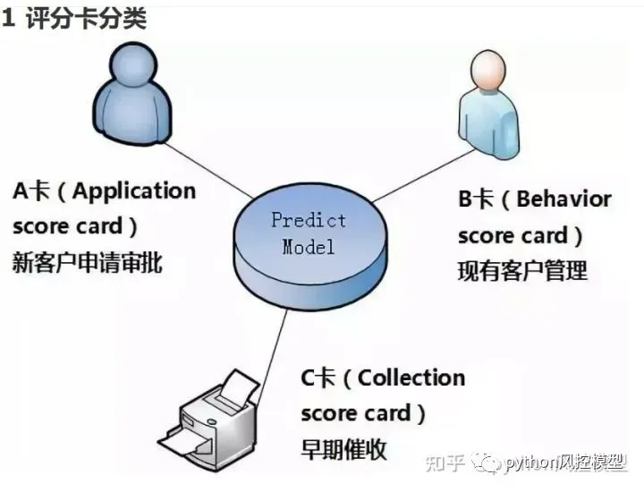 1.1 A card释义:Application scorecard 申请评分卡,对授信阶段提交的资料赋值的规则。举例:“进件”是传统银行的说法,指申请单。评分卡是对一系列用户信息的综合判断。随着可以收集到的用户信息变多,授信决策者不再满足于简单的if、else逻辑,而是希望对各个资料赋予权重和分值,根据用户最后综合得分判断风险,通过划定分数线调整风险容忍度,评分卡应运而生。评分卡是逻辑回归算法的一种衍生。1.2 B card释义:Behavior scorecard 行为评分卡,对贷后可以收集到的用户信息进行评分的规则。举例:与 A 卡类似,B卡也是一套评分规则,在贷款发放后,通过收集用户拿到钱后的行为数据,推测用户是否会逾期,是否可以继续给该用户借款。例如用户在某银行贷款后,又去其他多家银行申请了贷款,那可以认为此人资金短缺,可能还不上钱,如果再申请银行贷款,就要慎重放款。B卡模型中,有很多存量管理的子模型,包括激活沉默客户模型,找出价值较高客户,增加贷款额度模型等等。1.3 C card释义:Collection Scorecard 催收评分卡,对已逾期用户未来出催能力做判断的评分规则。举例:催收评分卡是行为评分卡的衍生应用,其作用是预判对逾期用户的催收力度。对于信誉较好的用户,不催收或轻量催收即可回款。对于有长时间逾期倾向的用户,需要从逾期开始就重点催收。逾期天数越多,催收难度越大。