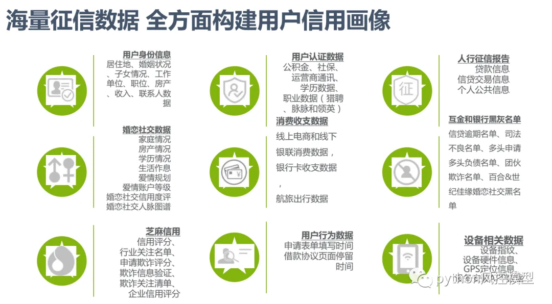 建模数据方面包含借款申请人填写的基本资料,通讯录,通话记录和其他运营商数据,以及在其他第三方平台提供的黑名单和其他借贷平台借贷还款数据,和app抓取的手机数据,有些还包含人行征信,社保公积金工资银行流水,个人消费等数据,针对不同额度和客群需要用户填写和授权的资料不一样。收集需要的数据后,通过SQL提取相关变量特征构造建模用的宽表。具体建模信息如下图。