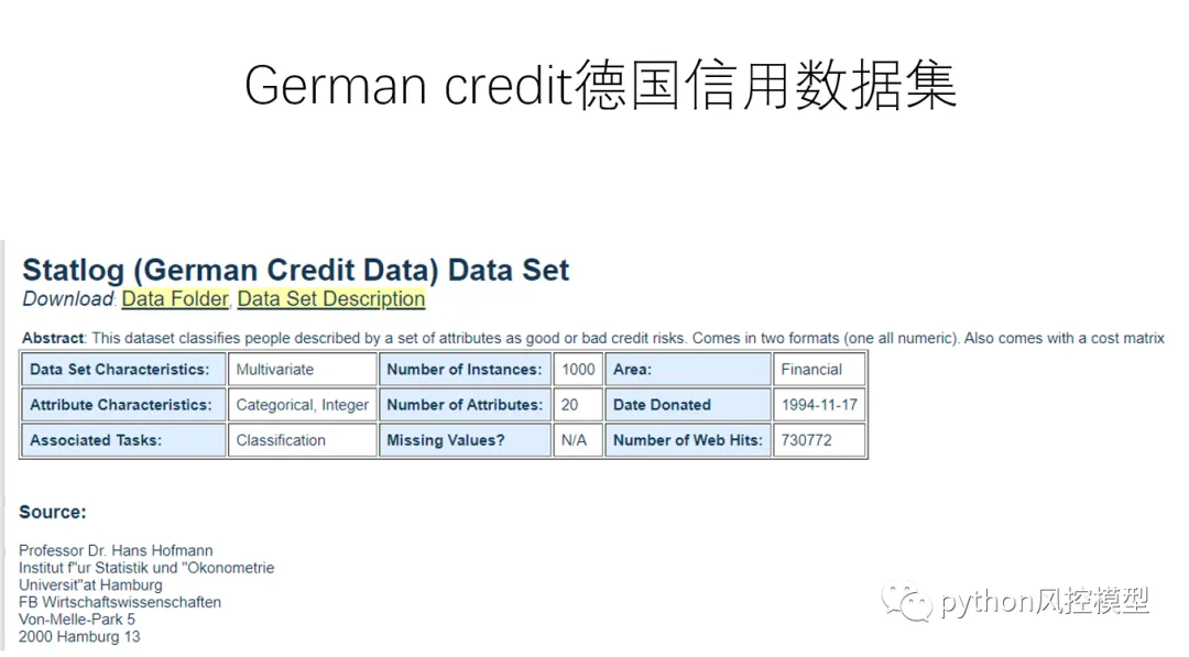 之前我讲过利用German credit德国信用数据集建立python信用评分卡模型,该数据集优势是数据量小,对计算机硬件要求不高,方便各个阶层学员学习和测试。