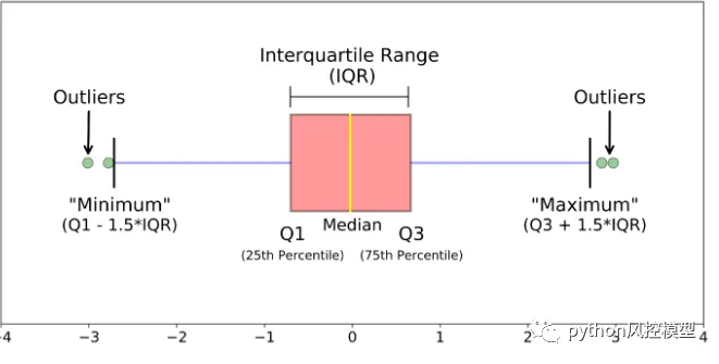 缺失值处理后,我们需要进行异常值检验。异常值分为统计学上异常值和业务上异常值。统计学异常值通常用箱型图来判断,如下图。