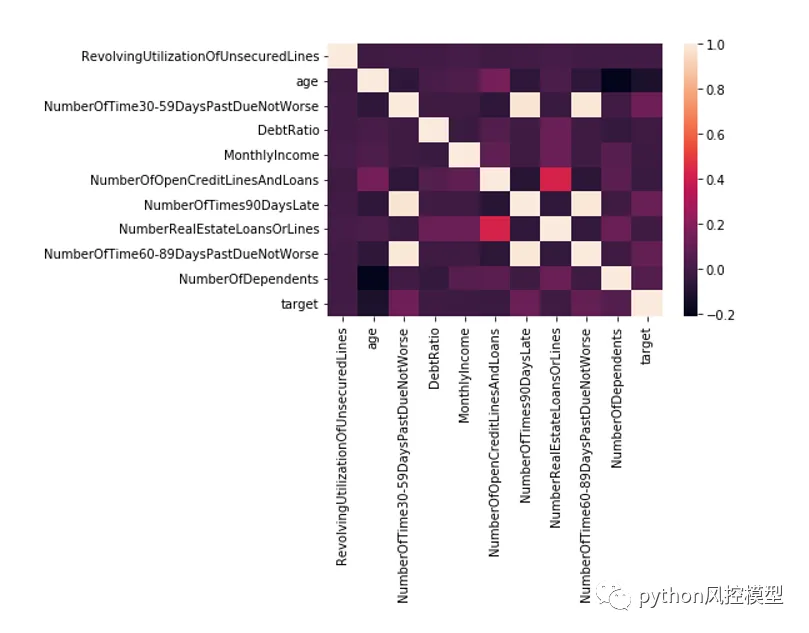 give me some credit数据集所有变量相关性的热力图,可以分析出有6对变量相关性非常高,变量筛选时候需要注意。
