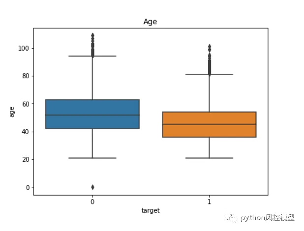 give me some credit数据集age年龄变量关于好坏客户的分类箱型图统计。我们可以看到好客户年龄中位数要高于坏客户年龄中位数。