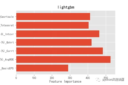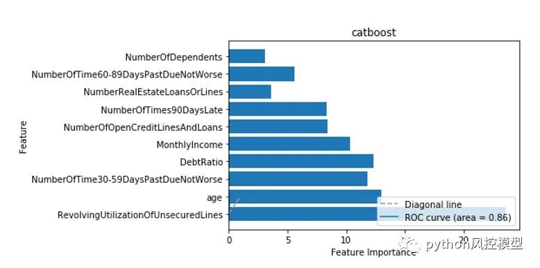 《python信用评分卡建模(附代码)》教程中集成树算法catboost的feature importance可视化图,我们可以明显看出RevolvingUtilizationOfUnsecuredLines可用额度比值变量的重要性最高。图中蓝色柱越长,重要性越大,反之亦然。