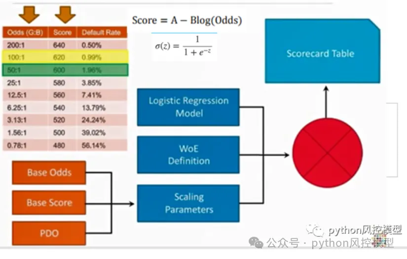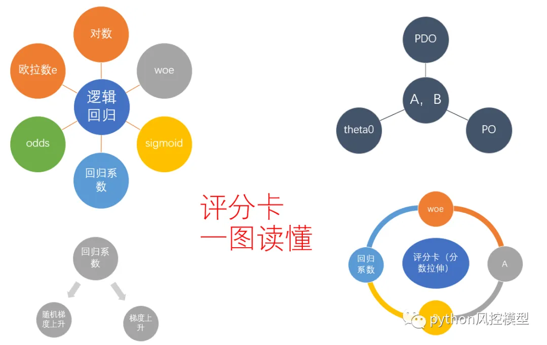 《python信用评分卡建模(附代码)》中评分卡生成有详细章节讲解,包括PDO,theta0,P0,A,B,odds,woe,iv等专业术语有完全解读。