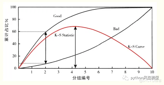 在完成一个模型后,将测试模型的样本平均分成10组,以好样本占比降序从左到右进行排列,其中第一组的好样本占比最大,坏样本占比最小。将KS检验应用于信用评级模型主要是为了验证模型对违约对象的区分能力,通常是在模型预测全体样本的信用评分后,将全体样本按违约与非违约分为两部分,然后用KS统计量来检验这两组样本信用评分的分布是否有显著差异。