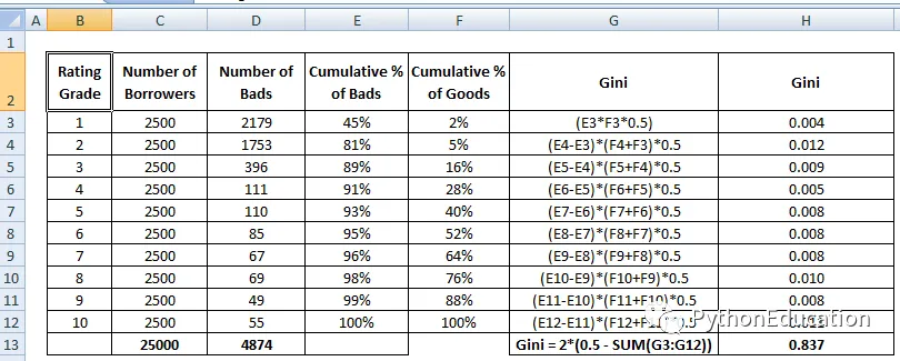 基尼系数显示的是好客户的比例(累计),而不是所有客户。它显示了模型与随机模型相比具有更好分类能力的程度。它也被称为基尼指数。基尼系数可以取-1 到1 之间的值。负值对应于分数含义相反的模型。