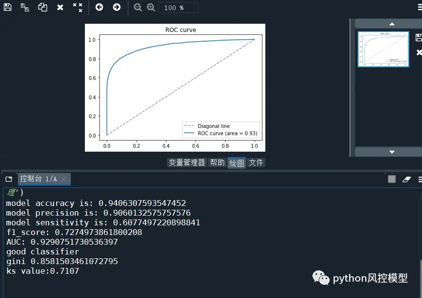 《python信用评分卡建模(附代码)》教程中训练模型AUC为0.929,具体模型性能如下: