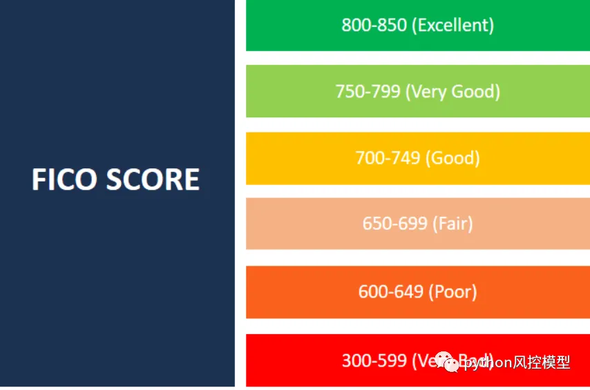 模型根据逻辑回归的变量系数和WOE值来生成评分卡。评分卡方便业务解释,已使用几十年,非常稳定,深受金融行业喜爱。其方法就是将Logistic模型概率分转换为300-900分的标准评分的形式。国内绝大多数信用评分卡都效仿的美国FICO分数。