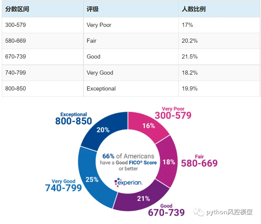 如下图, FICO信用分在very poor300-579分的占比最低,只有17%;good670-739分的占比最高,达到21.5%。