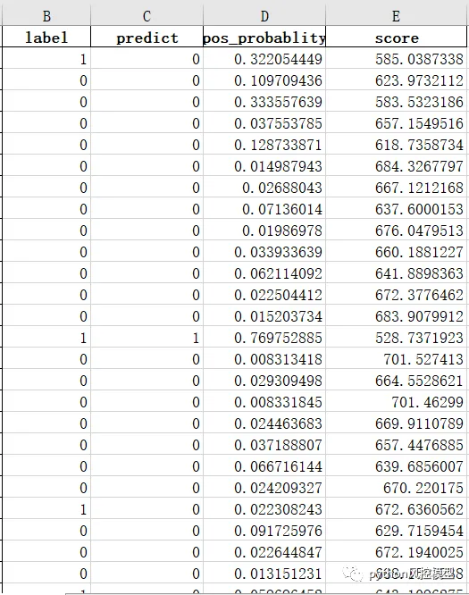 我们通过上面基础,可以生成自动化评分系统,对每个申请单用户生成好坏客户真实标签,好坏客户预测标签,坏客户概率值,拉伸评分。