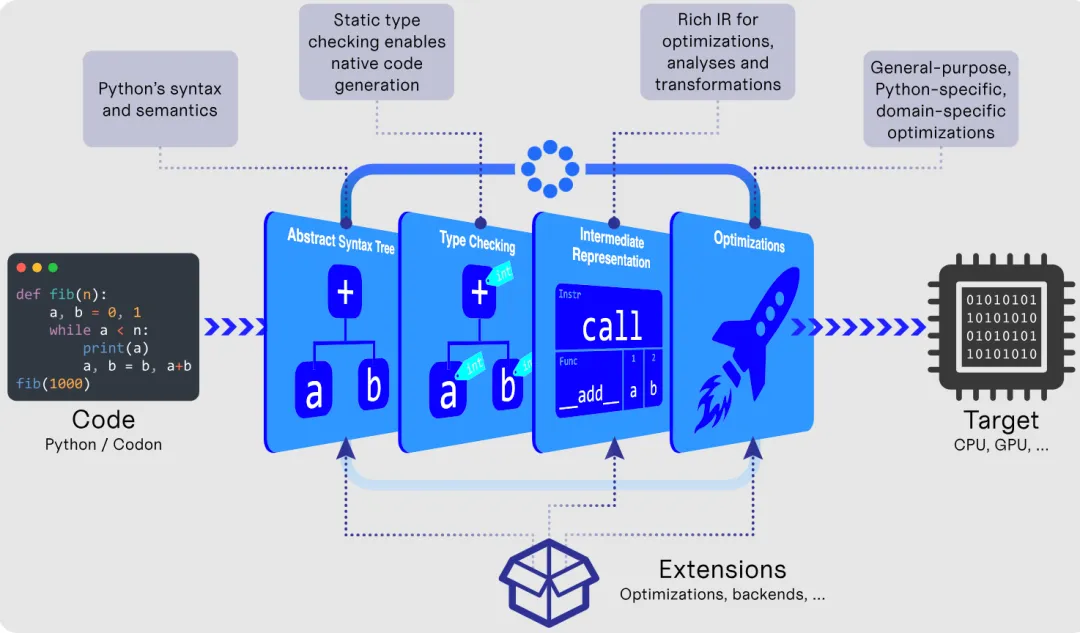 不同于 Python 的解释执行,Codon 采用 ahead-of-time(AOT)编译。它会分析你的整个程序,进行激进优化,并通过 LLVM(Rust、Swift 等语言也用的编译基础设施)编译为原生 machine code。
