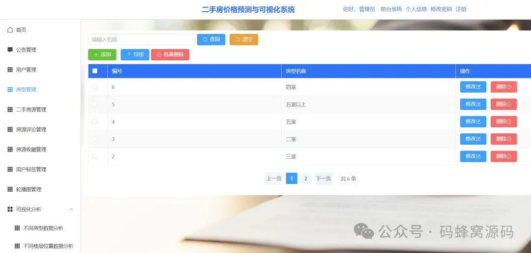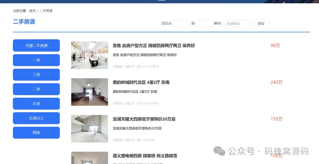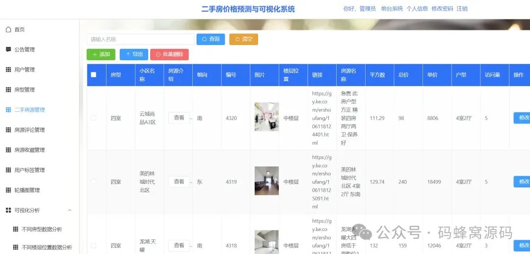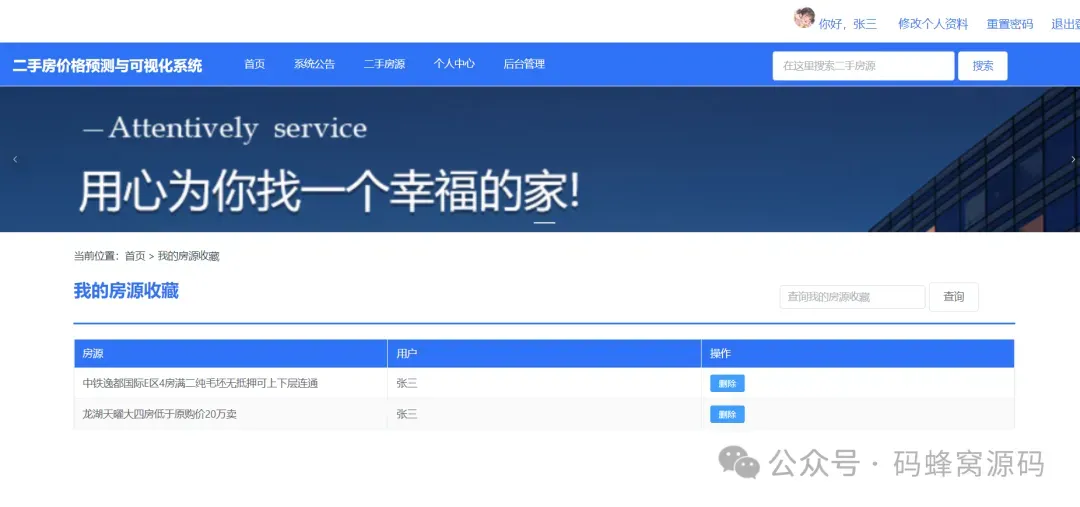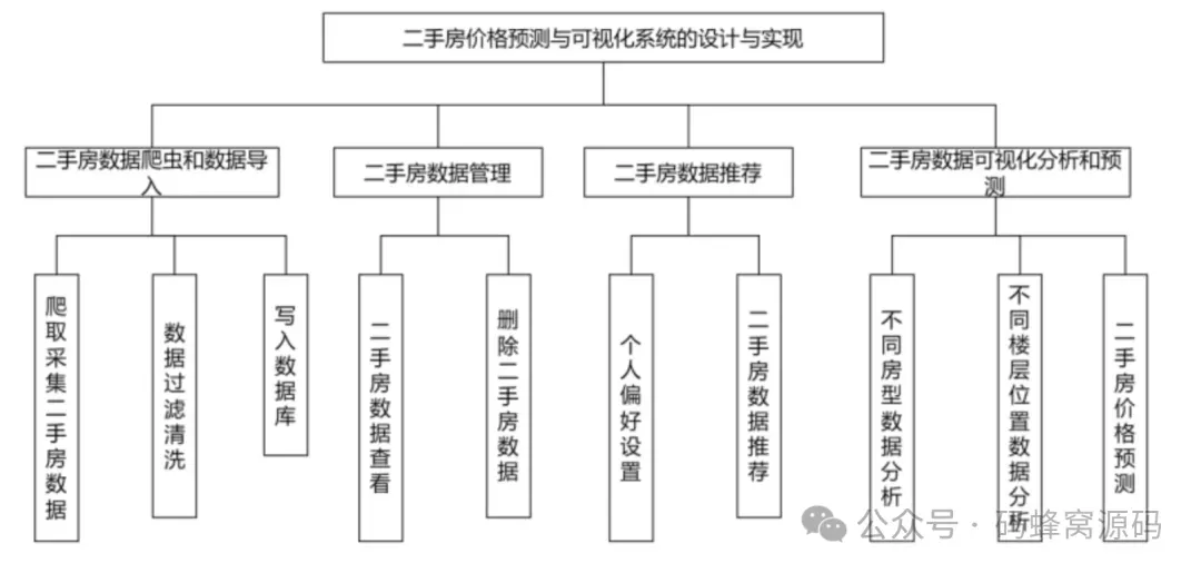 二手房价格预测与可视化系统的重要核心功能首页、系统公告、查询二手房房源、二手房房源收藏、房源偏好设置、个性化推荐二手房源、二手房数据可视化、二手房价格预测等。具体功能模块如下: