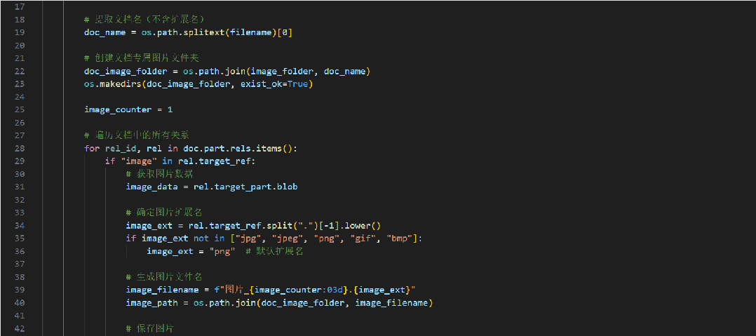 def extract_images_from_docs():# 创建图片保存文件夹 image_folder = "提取的图片" os.makedirs(image_folder, exist_ok=True)for filename in os.listdir("含图片文档"):# 遍历文档中的所有关系for rel_id, rel in doc.part.rels.items():if"image"in rel.target_ref:# 获取图片数据 image_data = rel.target_part.blob# 确定图片扩展名 image_ext = rel.target_ref.split(".")[-1].lower()if image_ext not in ["jpg", "jpeg", "png", "gif", "bmp"]: image_ext = "png"# 默认扩展名# 生成图片文件名 image_filename = f"图片_{image_counter:03d}.{image_ext}" image_path = os.path.join(doc_image_folder, image_filename)# 保存图片 with open(image_path, "wb") as f: f.write(image_data)print(f"从 '{filename}' 提取图片: {image_filename}") image_counter += 1if image_counter == 1:print(f"文档 '{filename}' 中没有找到图片")