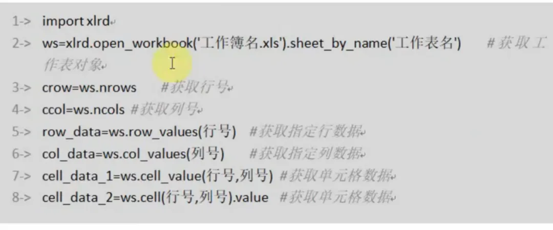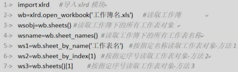 Ws(变量名)=xlrd.open_workbook('工作薄名.xls').sheet_by_name('工作表名')