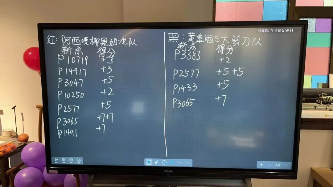 现场的电子白板实时更新小组积分,两组队员你追我赶,既有着激烈的竞争,又充满了温暖的互助。组内高队友一起讨论难题、碰撞思路,集体荣誉感拉满。