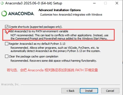 - 安装过程中,务必勾选“Add Anaconda to my PATH environment variable”(或类似选项),这能避免后续很多环境问题。