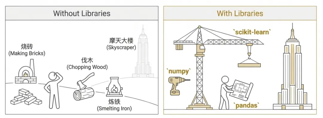 - 如果没有“库”,你就得从烧砖、伐木、炼铁开始,自己造出锤子、锯子、水泥……这几乎不可能完成。