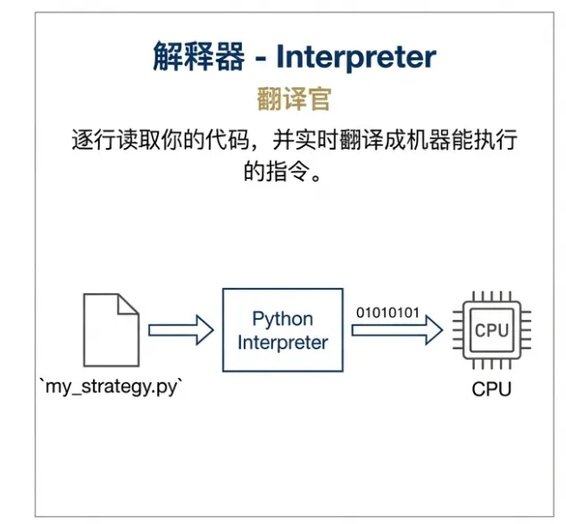 .py 文件里写的是人类能看懂的代码,但计算机CPU只认0和1的机器码。解释器的作用就是逐行读取你的代码,并实时翻译成机器能执行的指令。 - 为什么重要:安装 Python 本质上就是安装了这个解释器。当你在命令行输入
