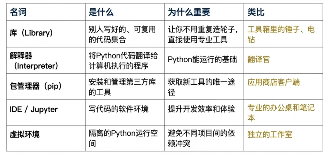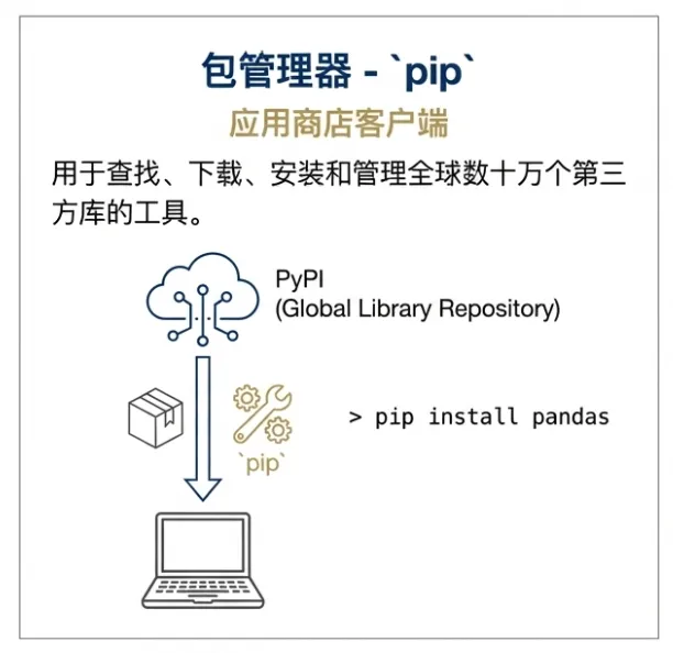 pandas 库?只需在命令行输入 pip install pandas,pip 就会自动帮你从官方仓库下载并安装好。 - 为什么重要:它是你获取所有强大工具(库)的唯一入口。