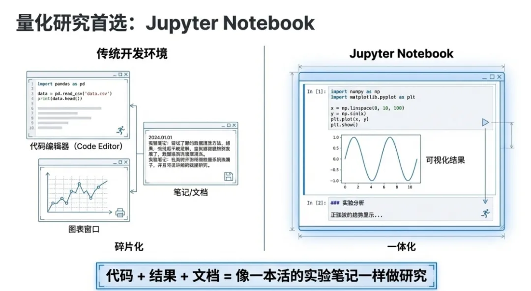 - Jupyter Notebook:量化领域最推荐的入门工具! 它以“单元格”形式运行代码,可以边写代码、边看结果、边加文字说明,像一本活的实验笔记,特别适合数据分析和策略研究。