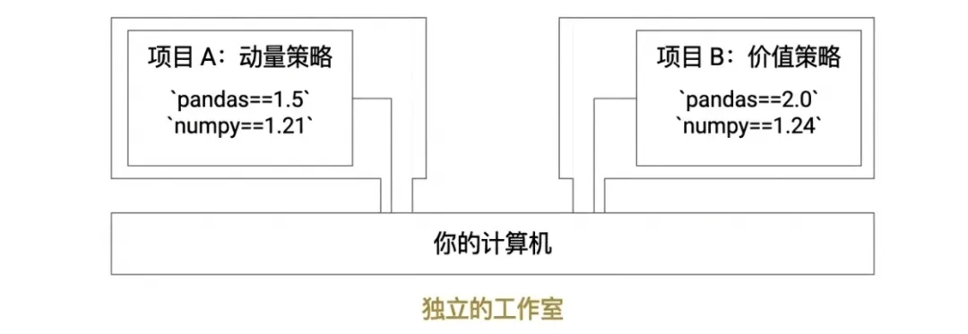 pandas 1.5 版本,项目B需要 pandas 2.0 版本。如果没有虚拟环境,这两个需求就会冲突。有了虚拟环境,你就可以为每个项目创建一个独立的房间,完美解决这个问题。 - 常用工具: