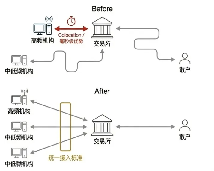 - 打击“速度套利”,而非“策略Alpha”:过去,少数高频机构通过将服务器紧邻交易所(即“colocated”),获得了毫秒级的速度优势,进行纯粹的“速度套利”。这被普遍认为是一种不公平的竞争,类似于“打游戏开挂”。新规通过统一接入标准,正是要消除这种由物理位置带来的不公。