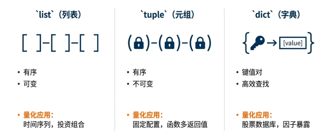 len():返回序列或集合的长度。用于统计持仓数量、数据点个数。sum():计算数值序列的总和。用于计算累计收益、总仓位。max() / min():找出序列中的最大/最小值。用于识别极端行情、计算回撤。sorted():对序列进行排序。用于因子排序、构建多空组合。zip():并行遍历多个序列。用于同时处理价格和成交量等多维数据。enumerate():在遍历时获取索引和值。用于需要位置信息的循环。