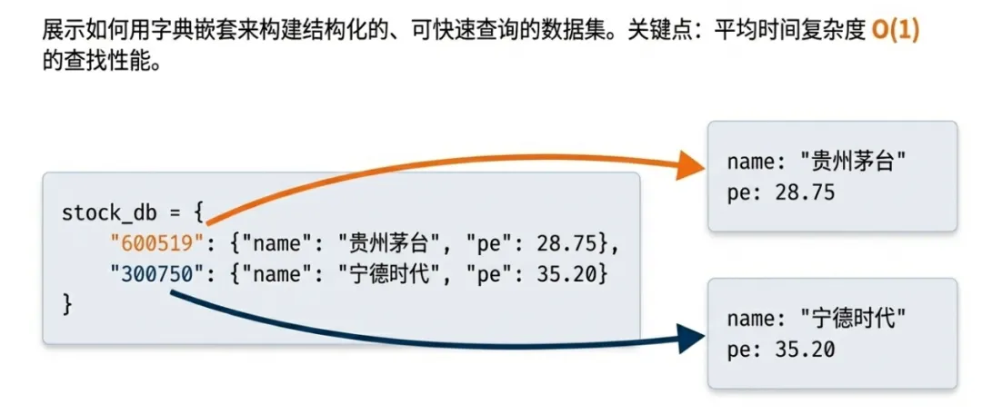 key: value)集合,通过键快速访问值。 - 构建股票信息数据库: