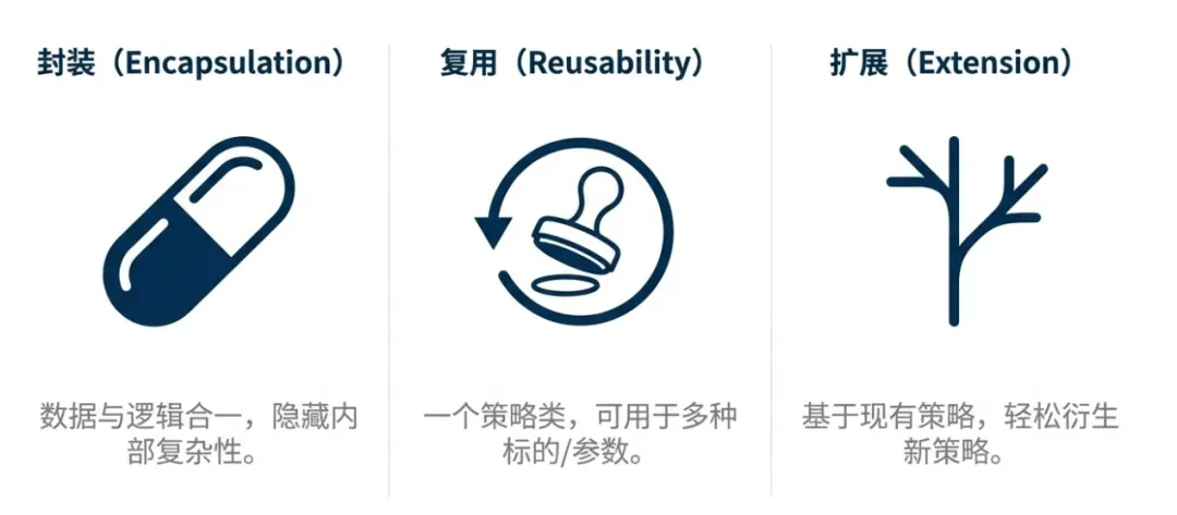 - 复用:一个策略类可以被实例化多次,用于不同标的或参数。