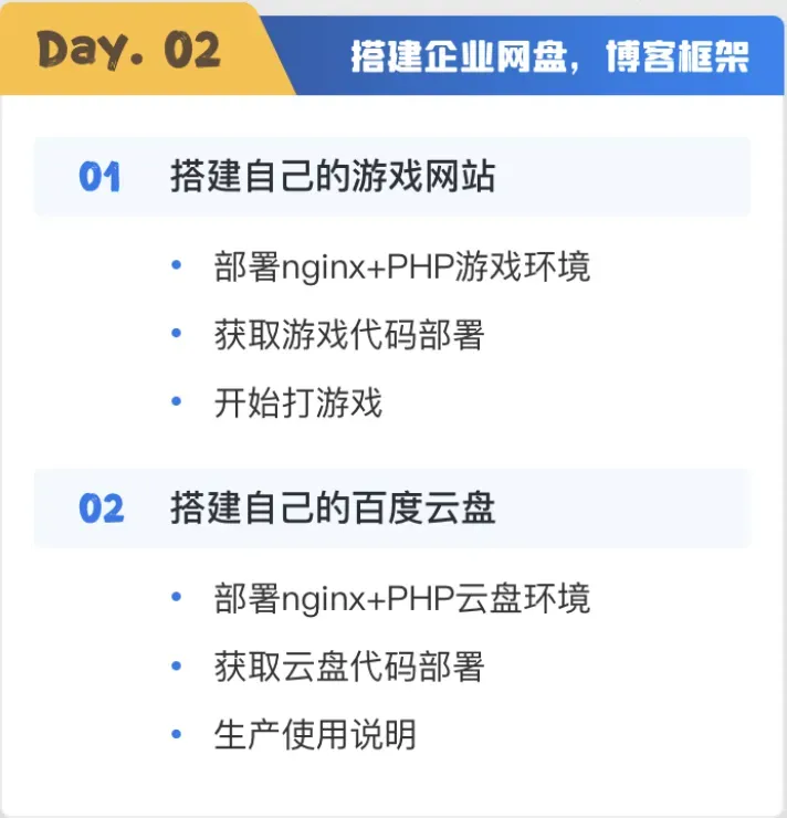 • 搭建自己的百度云盘、游戏网站,丰富自身实战能力......