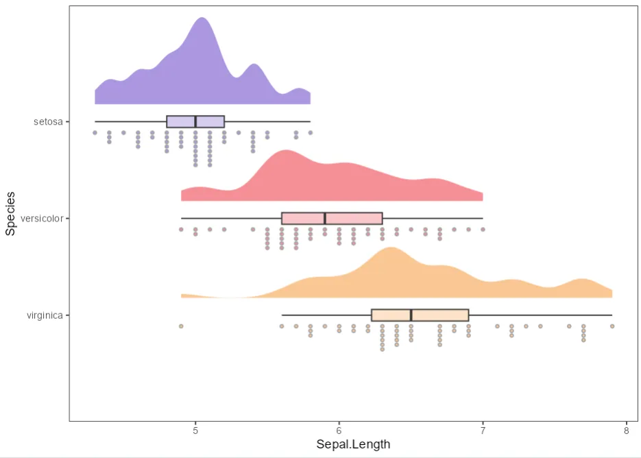 # install.packages("ggdist")# install.packages("tidyquant") # 仅为了配色,可选library(ggplot2)library(ggdist)# 1. 数据准备data <- irisdata$Species <- factor(data$Species, levels = c("virginica","versicolor","setosa"))# 2. 绘图p <- ggplot(data, aes(x = Species, y = Sepal.Length, fill = Species)) + # 2.1 左侧半小提琴(半眼) ggdist::stat_halfeye( adjust = .5, # 带宽 justification = -.2, # 向左移 .width = 0, # 不画区间横杠 point_colour = NA) + # 不画中心点 # 2.2 中间箱线 geom_boxplot( width = .12, outlier.color = NA, # 隐藏离群点 alpha = .5) + # 2.3 右侧散点 ggdist::stat_dots( side = "left", # 点朝右 justification = 1.1, # 向右移 binwidth = .03) + # 点大小 # 3. 美化 scale_fill_manual(values = c("#FAC794","#F58F96","#AB97E0")) + coord_flip() + # 横过来更直观 theme_bw() + theme(panel.grid = element_blank(), legend.position = "none")print(p)