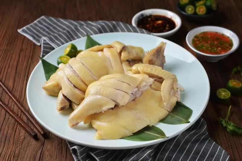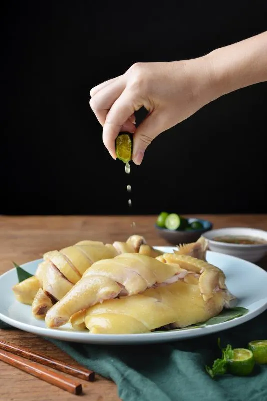 正宗的文昌鸡鸡肉质紧实而不柴、皮薄有弹性,煮熟后皮薄肉嫩、汁多味鲜。白切的烹饪手法也最显本味,通过“三烫三浸”和“冰水锁嫩”等传统工艺,锁住鲜嫩,蘸料里的小青桔汁更是点睛之笔,酸香解腻。