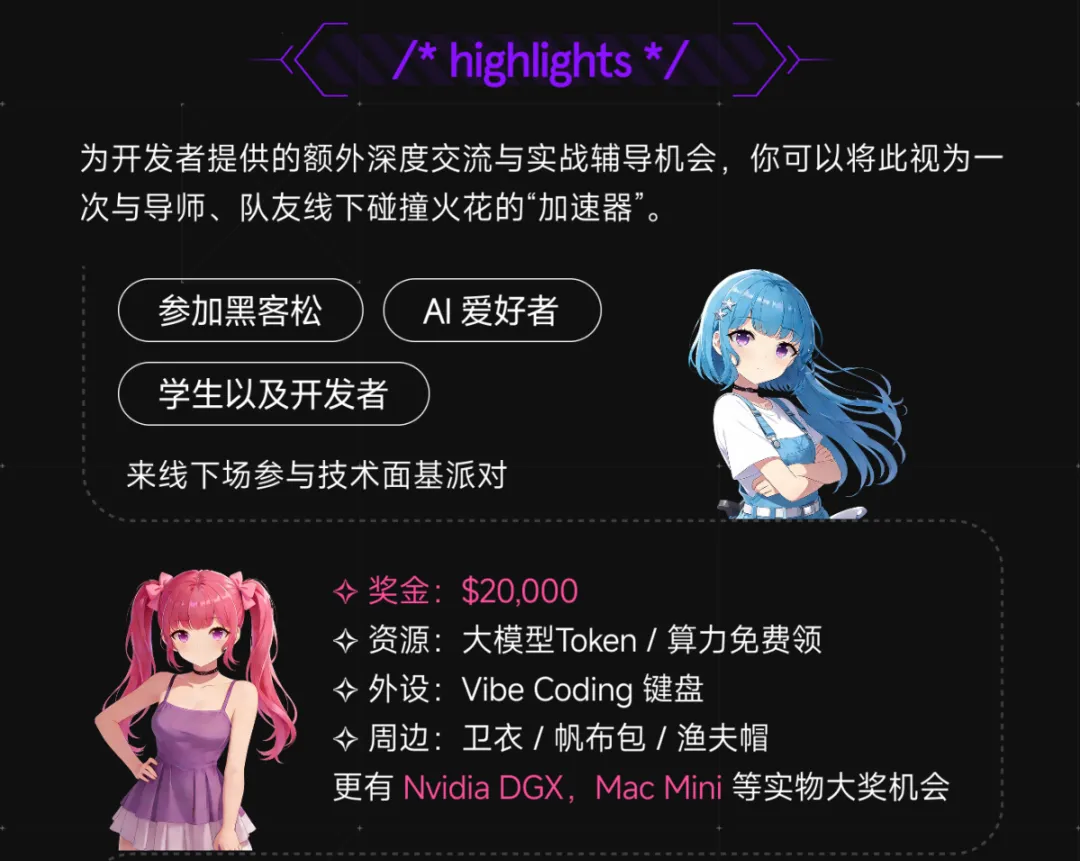 无论你身在何处,均可参与线上环节,享受同等技术辅导、资源支持与评奖资格。当然,无论是否报名 Hackathon,也非常欢迎亲临线下活动现场,与数百名开发者同台交流。