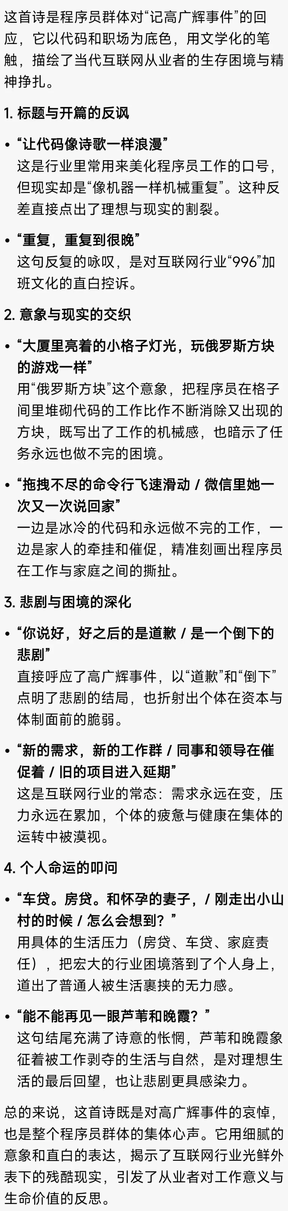 好久没写诗了,因为忙着工作,算是和高广辉一样,都和代码有关,不过是嵌入式,但然没有他实力强,是新入行的小白,关于和这个事件内容行业的群聊里讨论的也挺多的,毕竟大家都加班。加班近乎是一件正常的事,所以初始对他的逝去也没有太多关注,全国那么多互联网公司每年应该都会有程序员game over吧。后面震惊的是他的底薪只有3000,好吧程序员也是一群用时间换钱的家伙们。