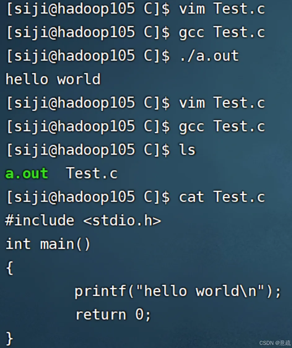 #include <stdio.h>int main(){ printf("hello world\n");return 0; }我们编写时如果不可以打字的话 按键盘上的i键就可以了,编译该文件gcc Test.c或cc Test.c也是可以的