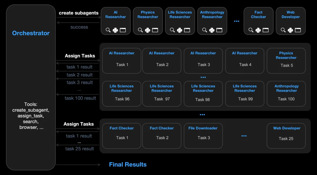 亮点满满:K2.5独创“代理群”机制,复杂任务时自动自导最多100个子代理,并行执行高达1500次工具调用,比单代理快4.5倍!无需预设子代理或流程,智能编排超高效。在HLE、BrowseComp、SWE-Verified等三大代理基准上,K2.5性价比碾压对手。